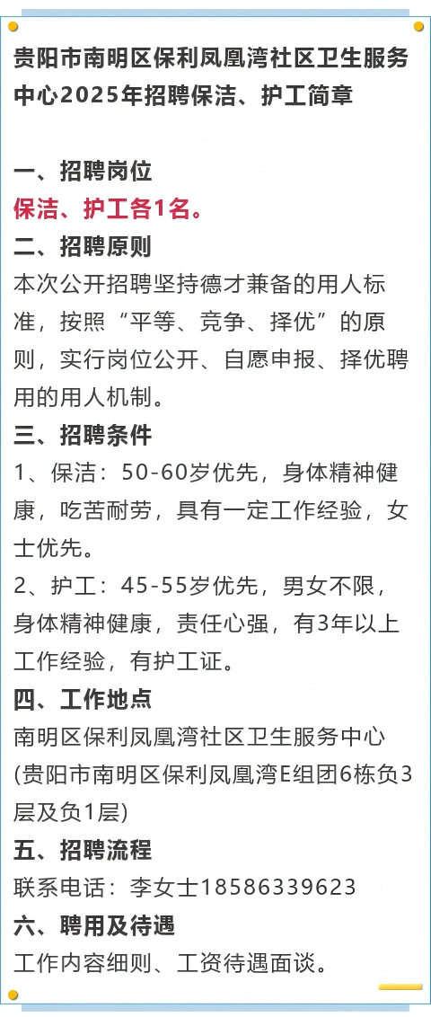贵阳市南明区保利凤凰湾社区卫生服务中心招聘保洁、护工!60周岁以下可报!