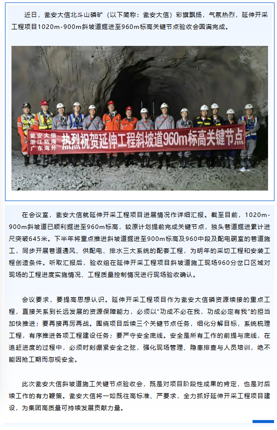 喜报!瓮安大信北斗山磷矿斜坡道960m标高关键节点超前完成