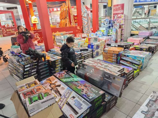 “比平时人流量大生意也更好了,这段时间每天最多的销售额能达到七八千。”华辰玩具批发负责人张才雯在2号馆的年货摊位积极叫卖,吸引了许多家长带着孩子前来挑选玩具。