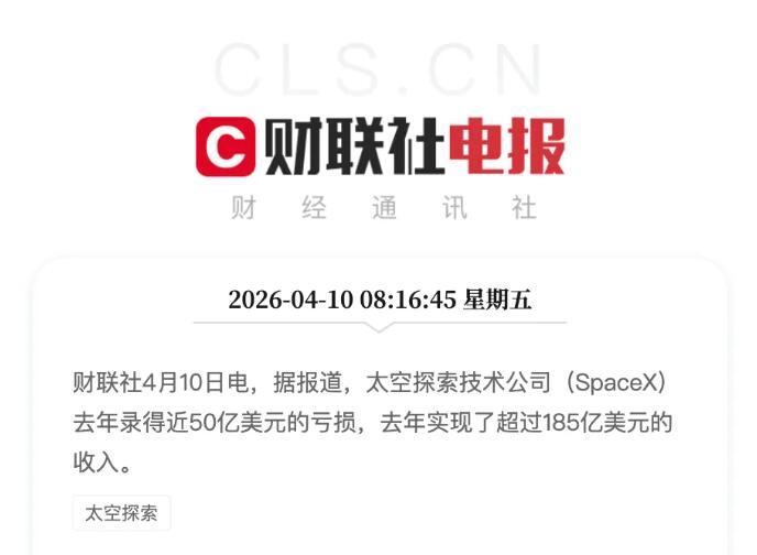 财联社4月10日消息,据报道,太空探索技术公司(SpaceX)去年录得近50亿美元的亏损,去年实现了超过185亿美元的收入。