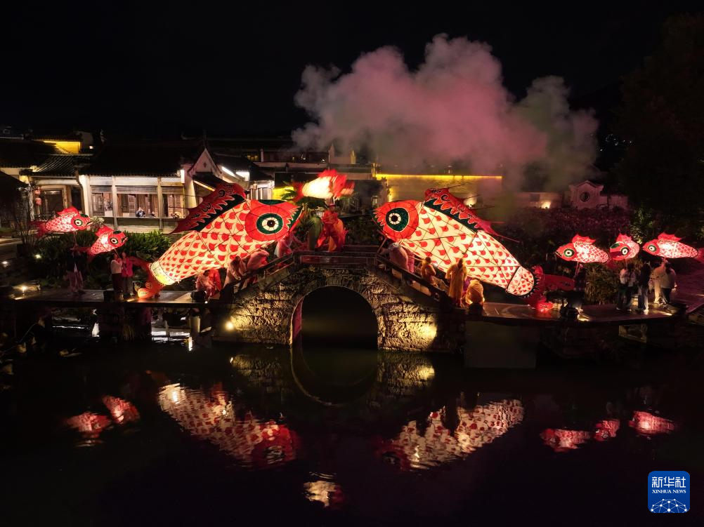 11月9日,游客在黄山市徽州区呈坎古村观赏鱼灯表演(无人机照片)。新华社记者 曹力 摄