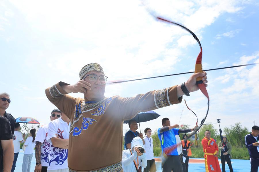 2023年7月2日,为期两天的赫哲族第十一届乌日贡大会在黑龙江省抚远市拉开帷幕,来自北京、哈尔滨等地的15支代表队的近千名赫哲族群众参加了传统体育竞赛、文艺比赛、中俄文化交流和文艺汇演等活动。图为7月3日,参赛队员在参加赫哲族传统体育竞赛项目射箭。许丛军摄/光明图片