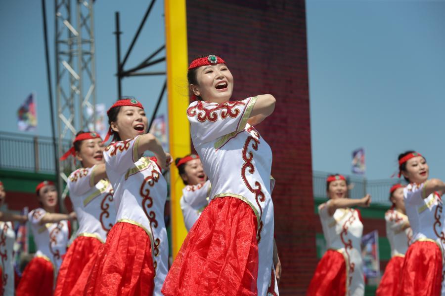 2023年7月2日,为期两天的赫哲族第十一届乌日贡大会在黑龙江省抚远市拉开帷幕,来自北京、哈尔滨等地的15支代表队的近千名赫哲族群众参加了传统体育竞赛、文艺比赛、中俄文化交流和文艺汇演等活动。图为7月3日,参赛代表队在进行文艺比赛和展演。许丛军摄/光明图片