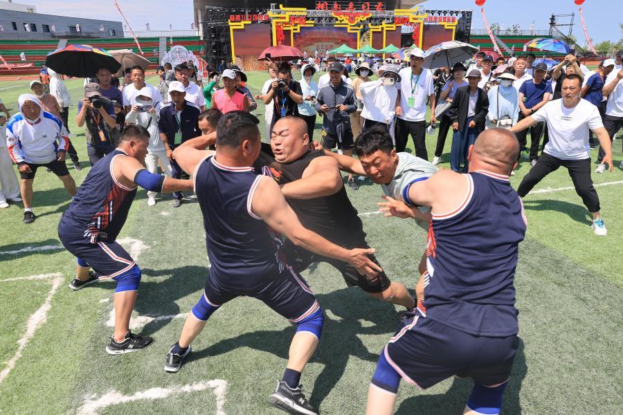 2023年7月2日,为期两天的赫哲族第十一届乌日贡大会在黑龙江省抚远市拉开帷幕,来自北京、哈尔滨等地的15支代表队的近千名赫哲族群众参加了传统体育竞赛、文艺比赛、中俄文化交流和文艺汇演等活动。图为7月3日,参赛队员在参加赫哲族传统体育竞赛项目杜烈其。许丛军摄/光明图片