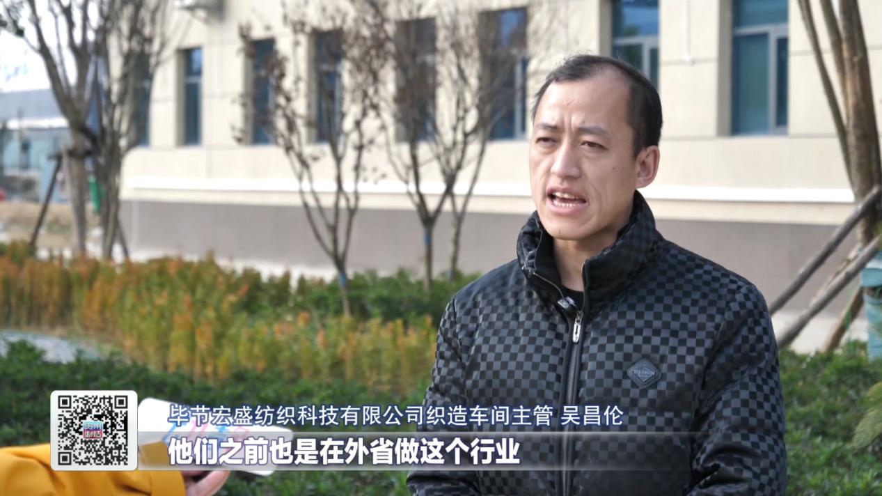 毕节宏盛纺织科技有限公司织造车间主管吴昌伦表示,他进入纺织行业将近20年了,之前都是在浙江工作。他在这里的收入是一万三一个月。他们车间工人有40来人,他们之前也是在外省做这个行业。