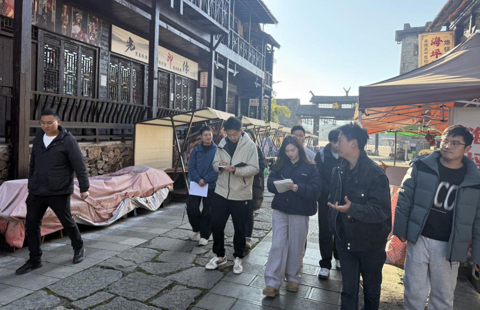 在野玉海国际旅游度假区,实践团实地考察了智能停车系统、语音导览服务、实时调度中心等数字化基础设施的建设与运行情况,了解火把节民俗活动中数字化手段的应用,包括球幕影院、立体光影秀等沉浸式体验项目。调研组与景区运营方围绕智慧设施的可持续运营、开放式景区客流管理、数字化精准营销等进行了交流。