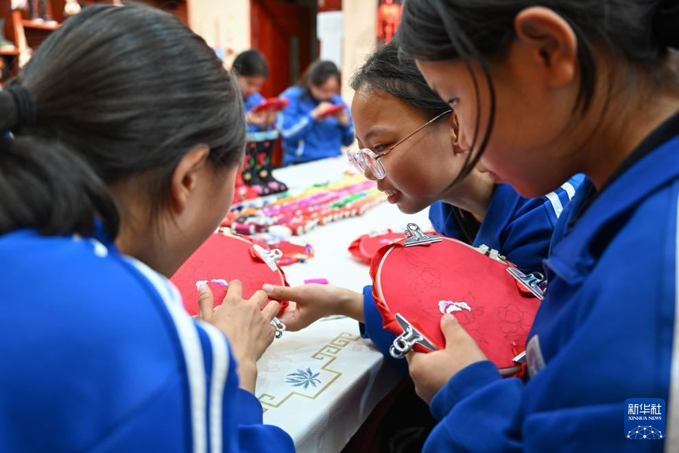 9月26日,在内蒙古兴安盟科右中旗巴彦呼舒第六中学,学生在交流刺绣技艺。新华社记者 贝赫 摄