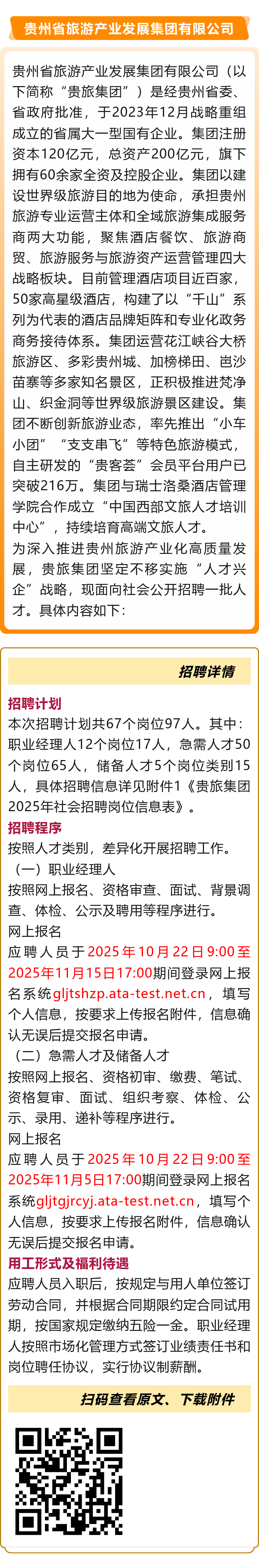 【国企】贵州省旅游产业发展集团有限公司67岗招聘97人!报名时间:2025年10月22日至11月5日!