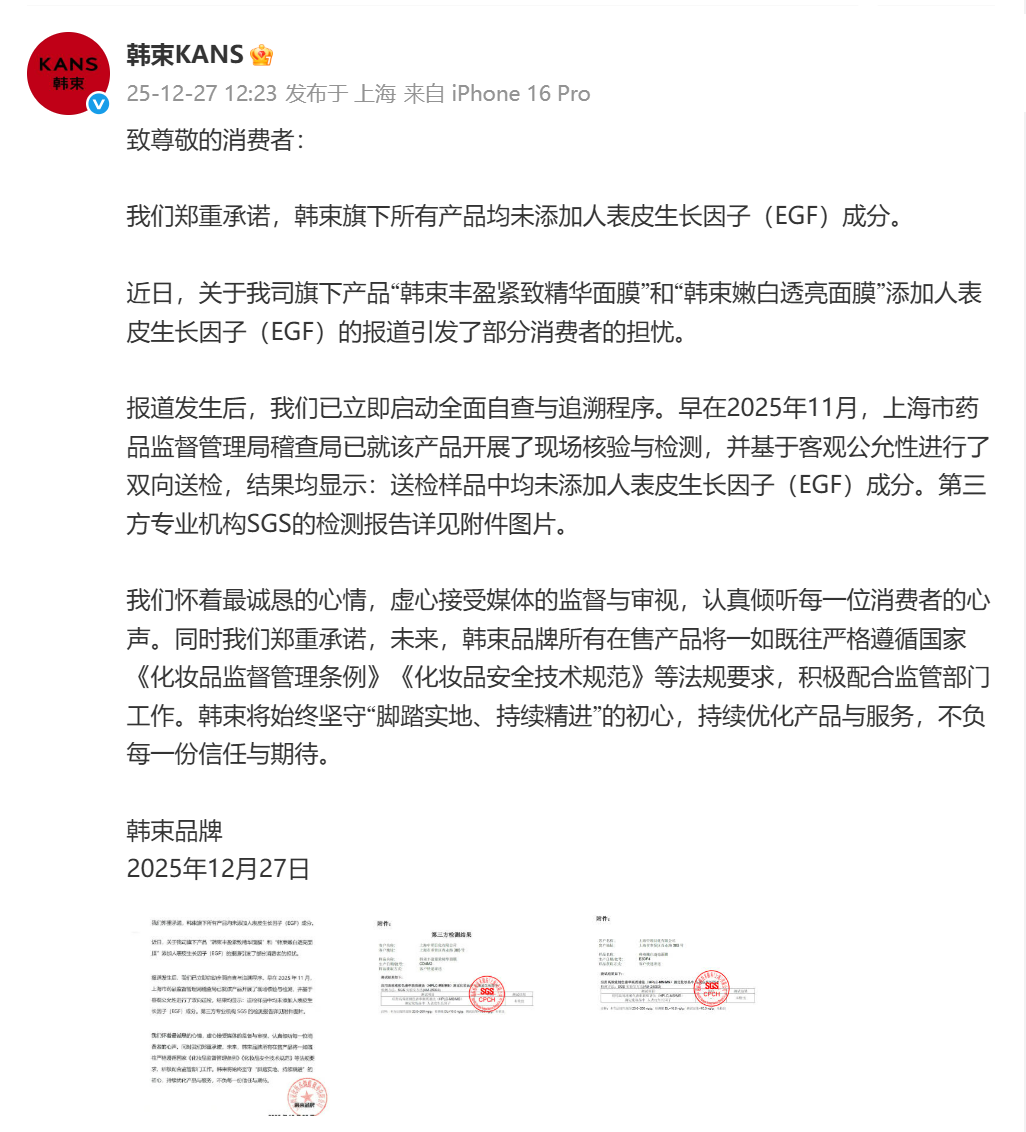 12月27日,@韩束KANS发文称:我们郑重承诺,韩束旗下所有产品均未添加人表皮生长因子(EGF)成分。