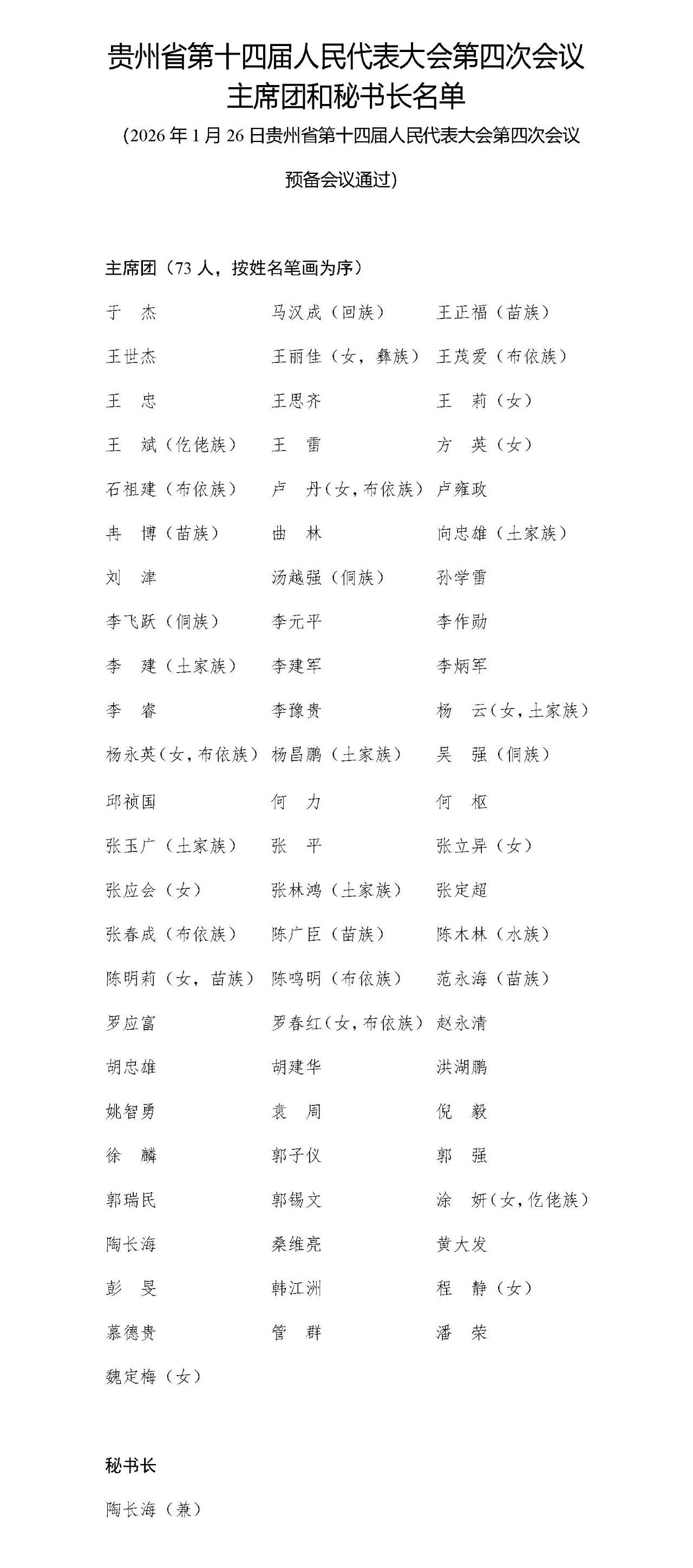 贵州省第十四届人民代表大会第四次会议主席团和秘书长名单