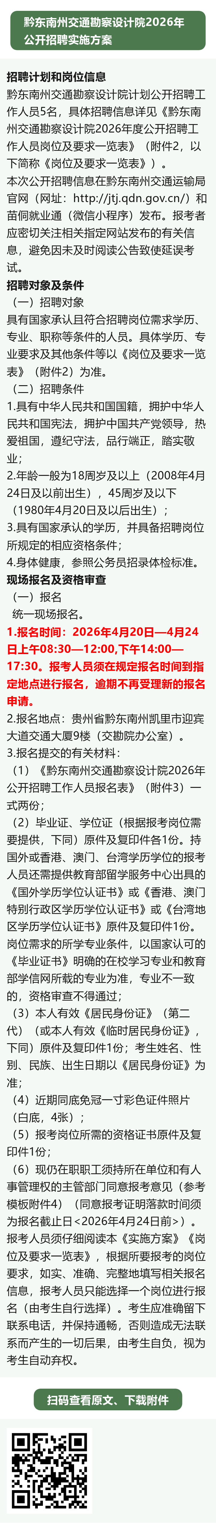 报名时间:2026年4月20日—4月24日!黔东南州交通勘察设计院招聘!