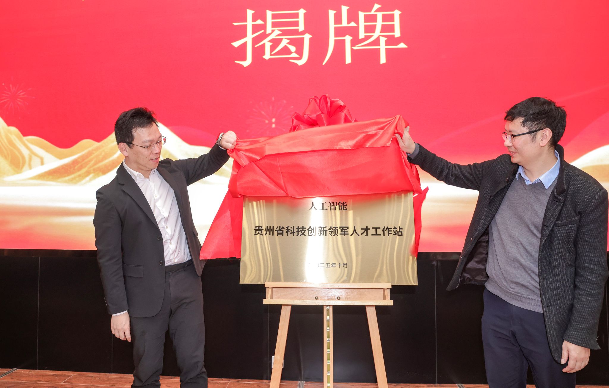 仪式现场,纪荣嵘与伍权共同为“人工智能贵州省科技创新领军人才工作站”揭牌。