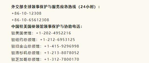 ▲近期,美国枪击暴力和针对亚裔歧视事件频发。外交部领事司和中国驻美使领馆提醒在美中国公民和临时赴美人员密切关注当地社会治安形势,加强自身安全防范。如遇紧急情况,请及时与中国驻美使领馆联系寻求帮助。【详情】