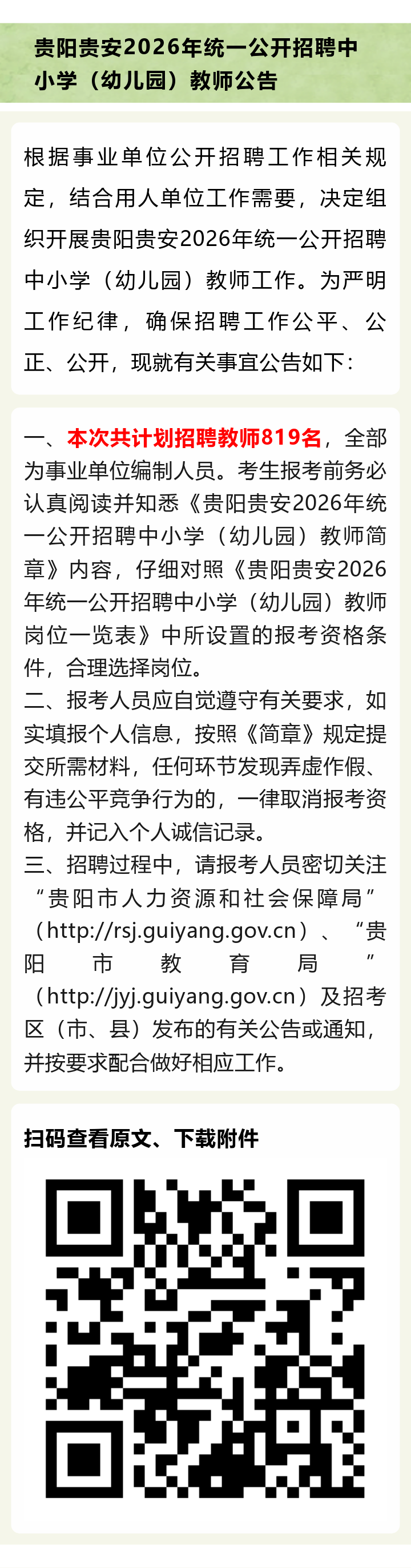 编内正式!贵阳贵安2026年统一公开招聘中小学(幼儿园)教师819名!