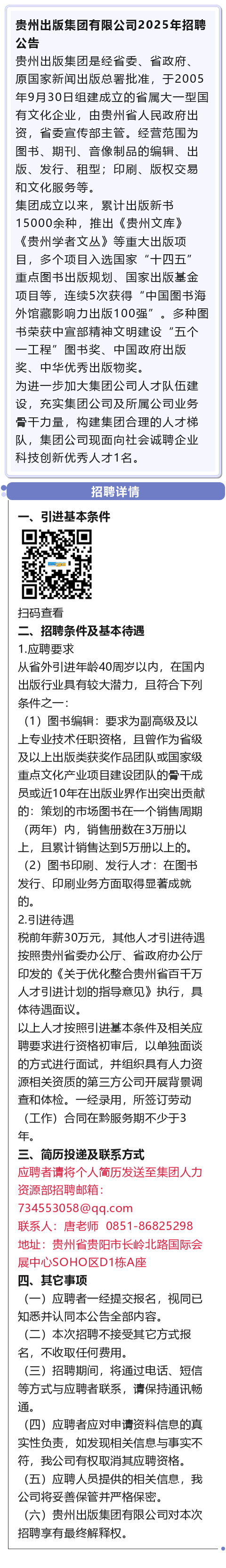 【国企】贵州出版集团有限公司招聘!年薪30万元!