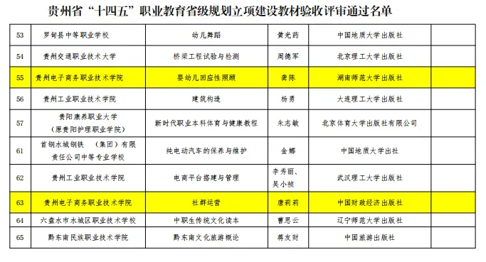 近日,省教育厅公布了“十四五”职业教育省级规划教材备案审核和立项建设教材验收评审通过名单,贵州电子商务职业技术学院4本教材喜获佳绩—《E时代高职英语教程 1(第二版)》《建筑装饰材料与施工工艺》顺利通过备案审核,《婴幼儿回应性照顾》《社群运营》成功通过立项建设验收评审!