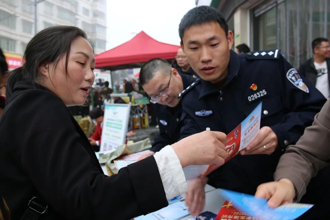 在万山镇,恰逢赶集日,人流熙攘、热闹非凡。各警种民警分工协作、密切配合,在集市核心区域设立宣传点位,通过悬挂主题横幅、摆放宣传展板、发放宣传资料、现场互动答疑等多种形式,向过往群众全方位普及国家安全知识,同时同步宣传电信诈骗、反邪反恐、禁毒等与群众生产生活密切相关的安全常识,让群众在赶集中学知识、在互动中强意识。