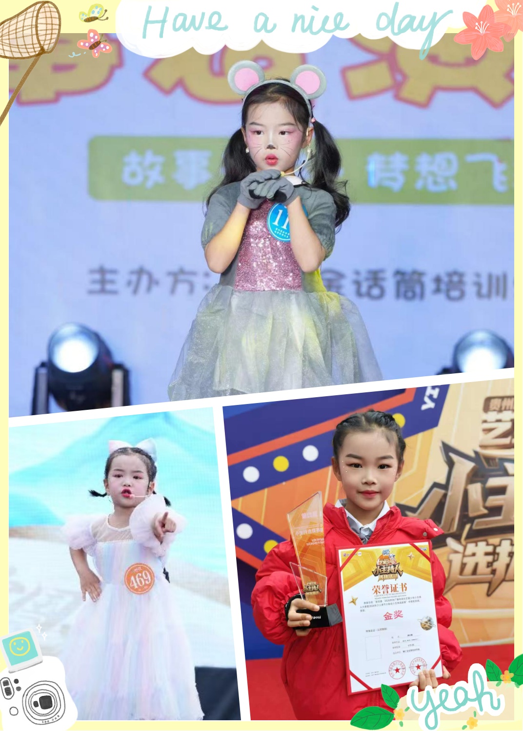 为了实现这个梦想,我一直在努力。在金话筒语言培训学校,我积极参加各种锻炼,也曾在故事大赛和朗诵比赛中分别获得金奖和银奖。这些宝贵的经历不仅让我积累了舞台经验,更让我懂得如何用声音表达情感、用眼神传递真诚。每一次握起话筒、站在台上,听到掌声响起的那一刻,心里都会涌起满满的快乐与成就感。