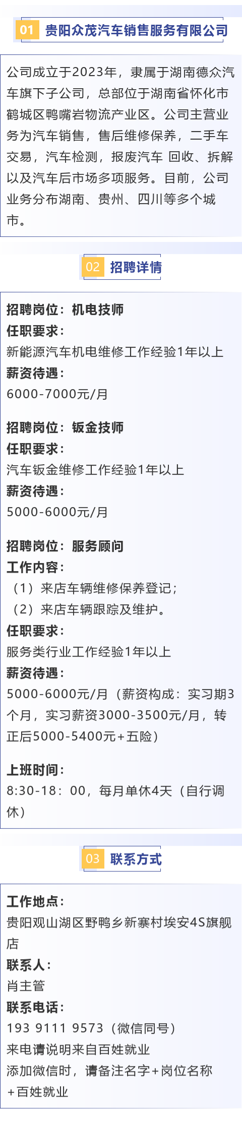 【贵阳市观山湖区】招聘机电技师、钣金技师、服务顾问!月薪5000-7000元!
