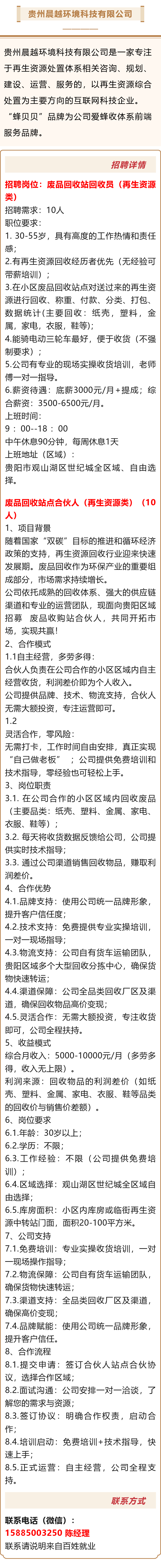 贵州晨越环境科技有限公司招聘!月薪可达10000元!