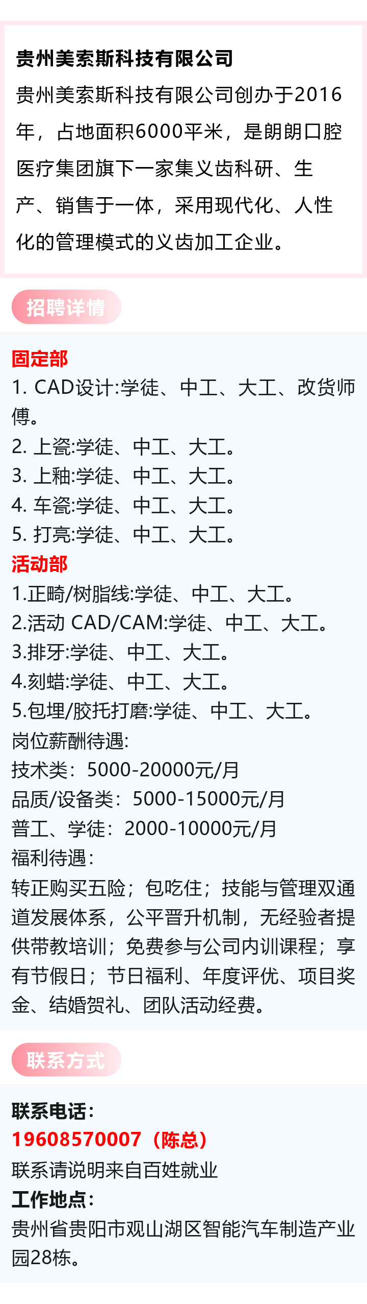 【朗朗口腔】义齿加工企业招聘!月薪可达15000元!包吃住!