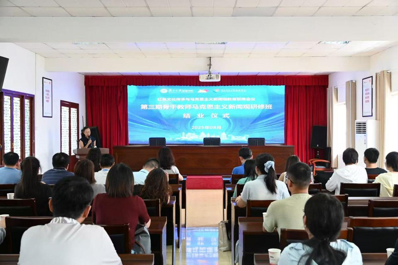 8月28日下午,第三期骨干教师马克思主义新闻观研修班在遵义会议纪念馆圆满结业。在结业仪式上,贵州师范大学传媒学院院长黄葵谈到,本次研修班扎实推进了马克思主义新闻观教学,她向学员致以结业祝贺,并明确今后将深化合作、共同开拓新闻教育新途径,为弘扬红色文化和践行马克思主义新闻观持续发力。复旦大学新闻学院副教授、高校红色文化传承与马克思主义新闻观教育联席会议秘书长唐荣堂表示,将持续与各位学员保持紧密联系,及时了解各校马克思主义新闻观教育课程的推进情况,并期待通过研修班、年会等多种形式,进一步推动红色文化传承与马克思主义新闻观教育的深度融合。学员代表闽南师范大学马海霞老师在总结学习感悟时,用“理论再充电、精神再补钙、使命再觉醒”概括此次研修的收获。她谈到,本次学习深化了对马克思主义新闻观作为新闻舆论工作“定盘星”和“导航仪”的理解,更加坚定了自己为党育人、为国育才的使命担当。