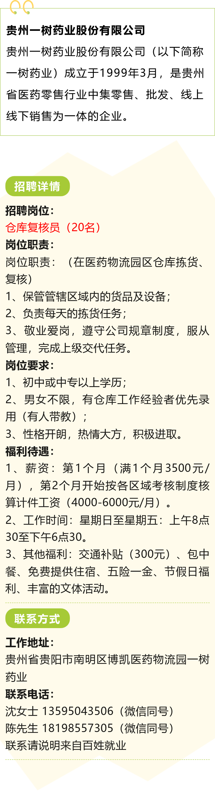 贵州一树药业股份有限公司招聘仓库复核员20名!免费提供住宿、五险一金!