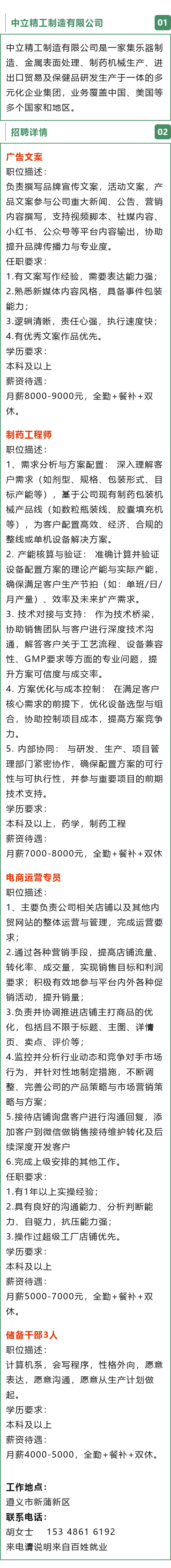 周末双休、餐补、月薪4000-9000元!中立精工制造有限公司4岗招聘!