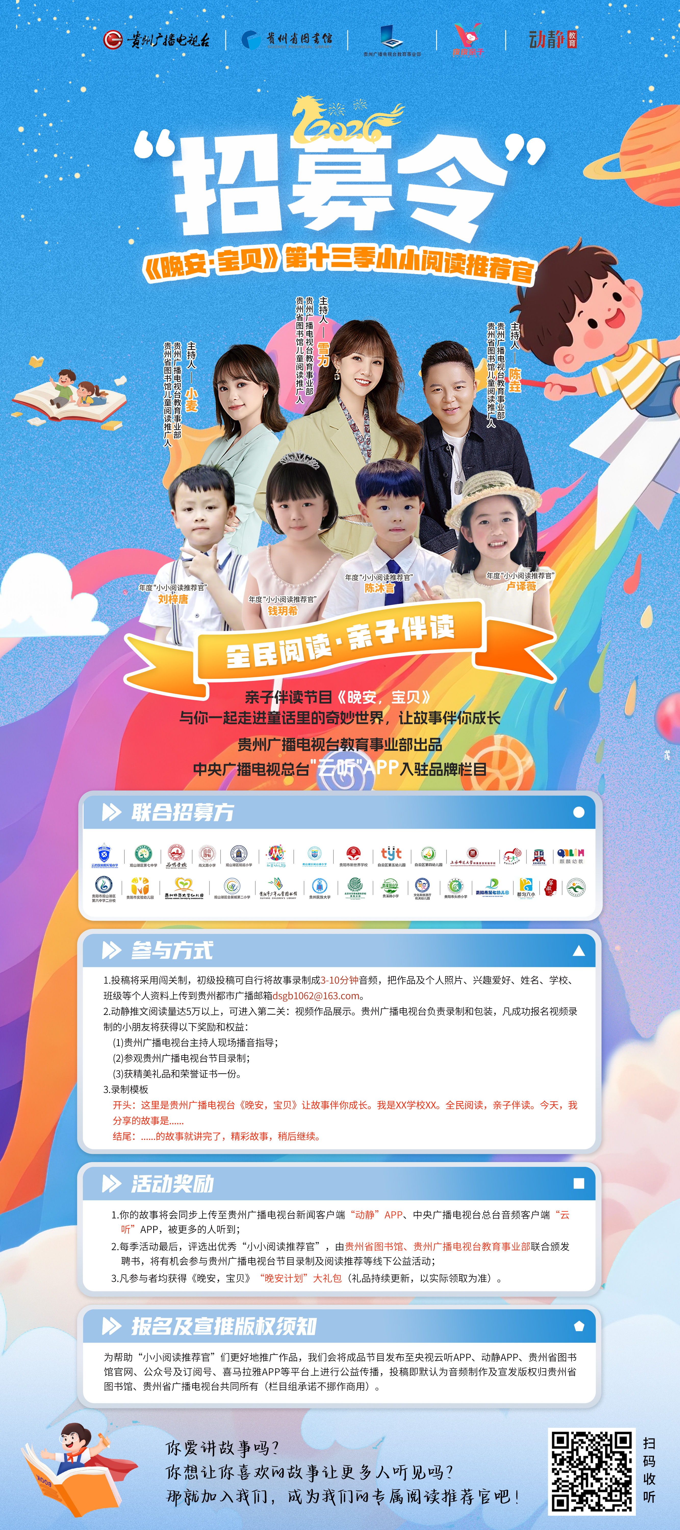 (5)每季活动最后,参加《晚安,宝贝》“小小阅读推荐官”聘书颁发仪式,由贵州省图书馆、贵州广播电视台教育事业部(GTV-6)联合颁发聘书,将有机会参与贵州广播电视台线下阅读公益活动,获得更多展示机会和荣誉。