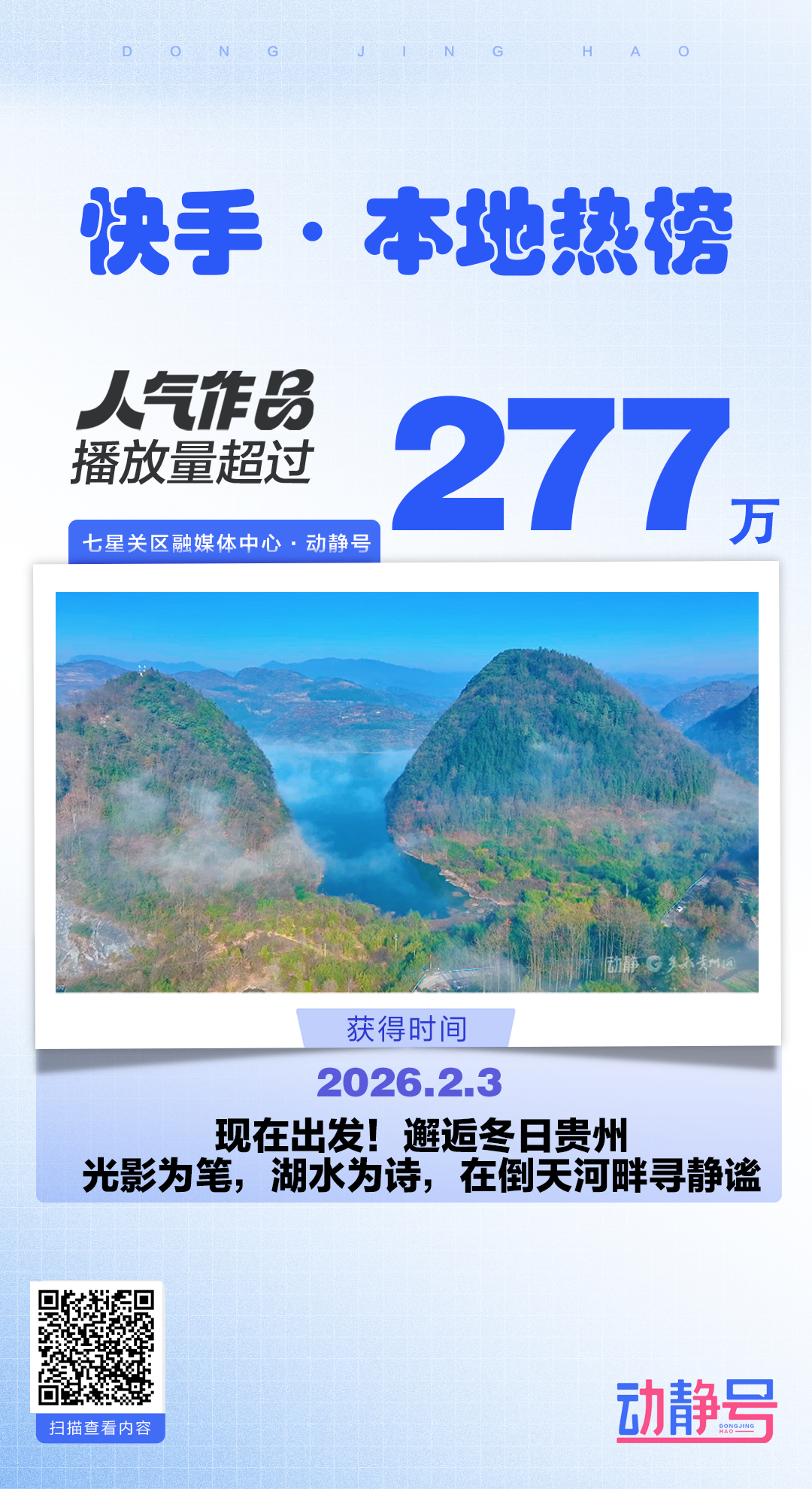 动静号编辑运用七星关区融媒体中心提供的视频素材,创作发布稿件《现在出发!邂逅冬日贵州丨光影为笔,湖水为诗,在倒天河畔寻静谧》。该内容一经发布,迅速登上快手本地榜,相关话题“冬日倒天河水库静谧诗篇”热度突破277万,展现了贵州冬季景致的诗意魅力。