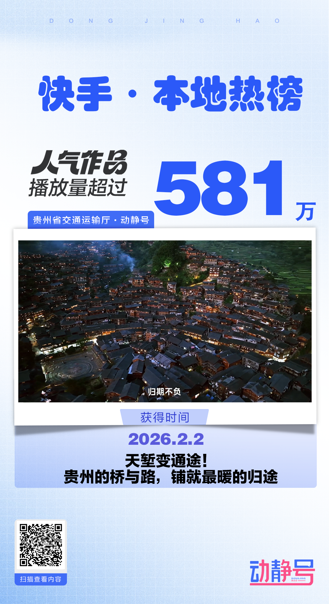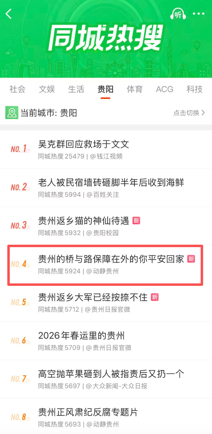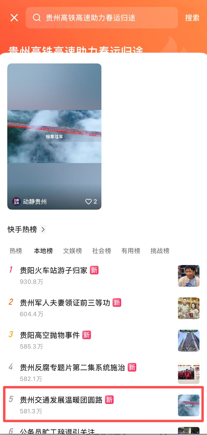 动静号联合贵州省交通运输厅推出稿件《天堑变通途!贵州的桥与路,铺就最暖的归途》。该稿件被省内多家媒体转发,学习强国总平台选用;相继登上微博同城热搜第4位及快手本地热榜第5位,快手平台相关话题“贵州交通发展温暖团圆路”热度累计突破581万。