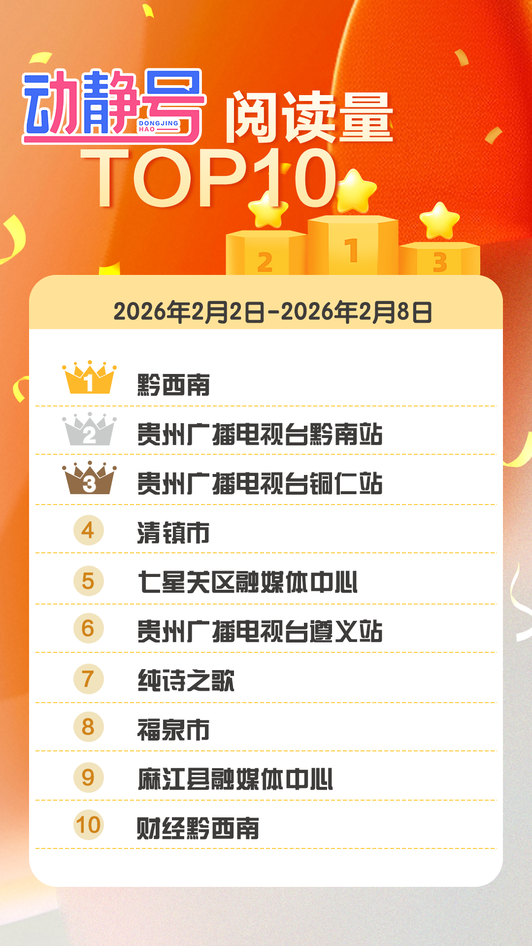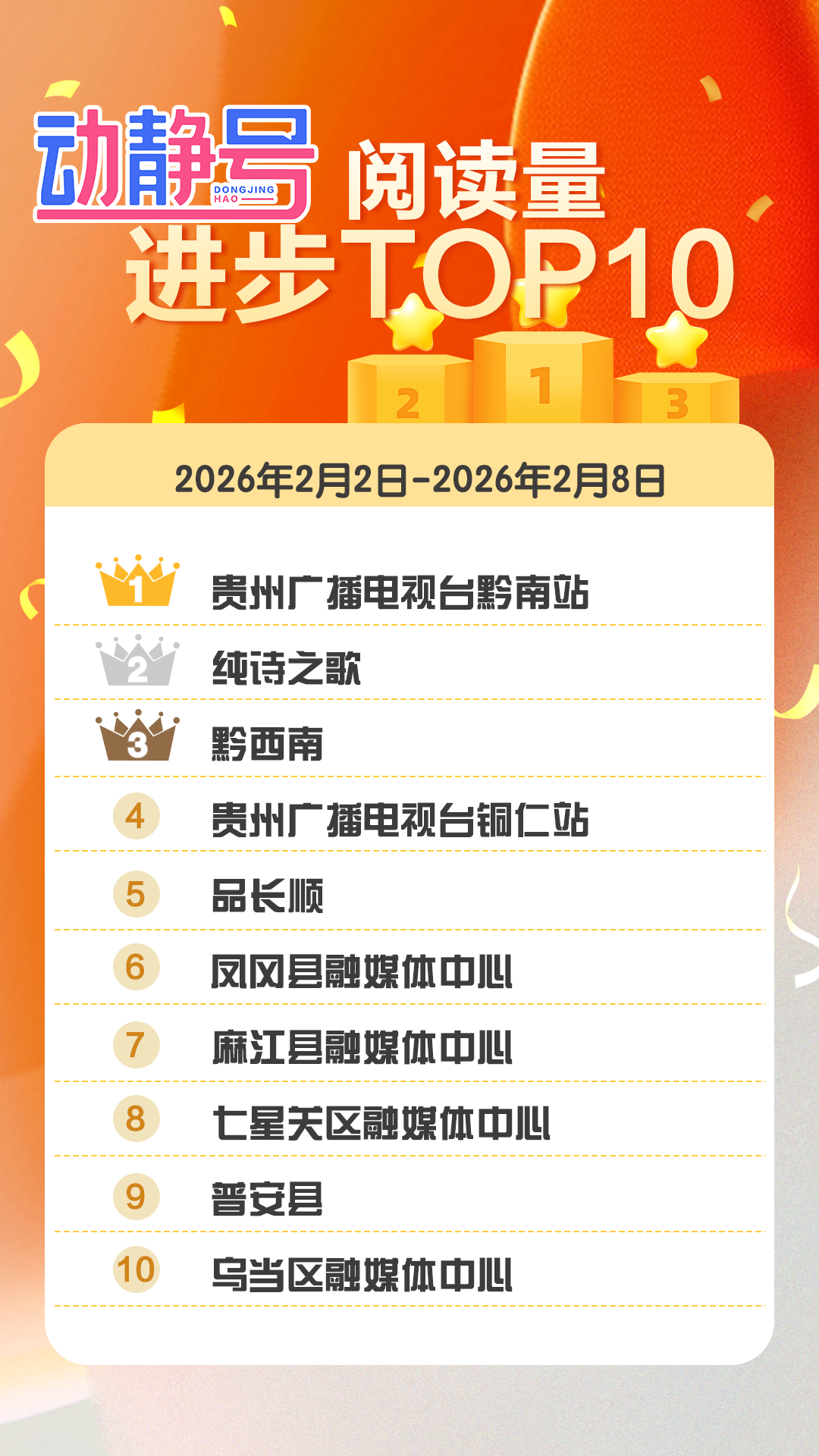 贵州广播电视台黔南站、纯诗之歌、黔西南同比上周,阅读量提升明显,增长热度均突破27万。