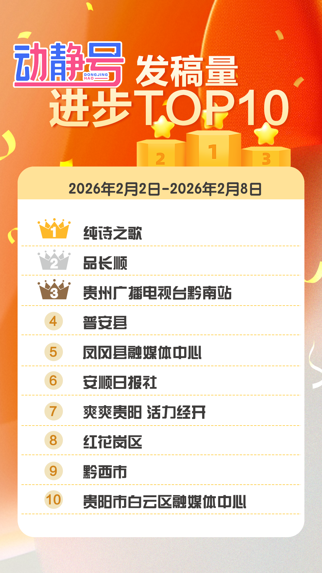 纯诗之歌、品长顺、贵州广播电视台黔南站发稿量同比上周,增幅均超20%以上。