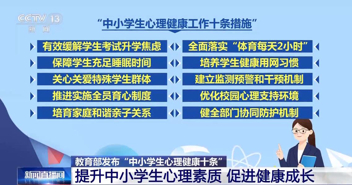 针对中小学生心理健康阶段性特点和突出问题,近日,教育部印发通知,出台《进一步加强中小学生心理健康工作十条措施》。包括:有效缓解学生考试升学焦虑、全面落实“体育每天2小时”、保障学生充足睡眠时间、培养学生健康用网习惯、关心关爱特殊学生群体等。