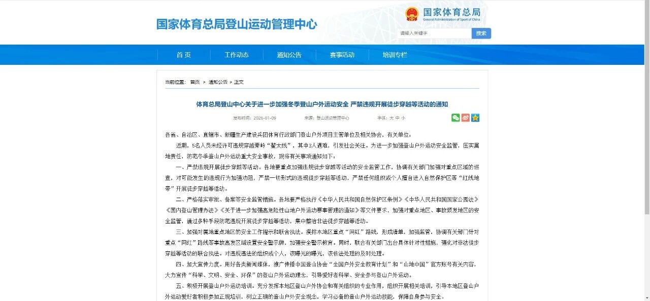 近期,5名人员未经许可违规穿越秦岭“鳌太线”,其中3人遇难,引发社会关注。为进一步加强登山户外运动安全监管,压实属地责任,防范冬季登山户外运动重大安全事故,总局登山中心于1月9日再度发文,要求各省、自治区、直辖市、新疆生产建设兵团体育行政部门登山户外项目主管单位及相关协会,有关单位安全相关工作。