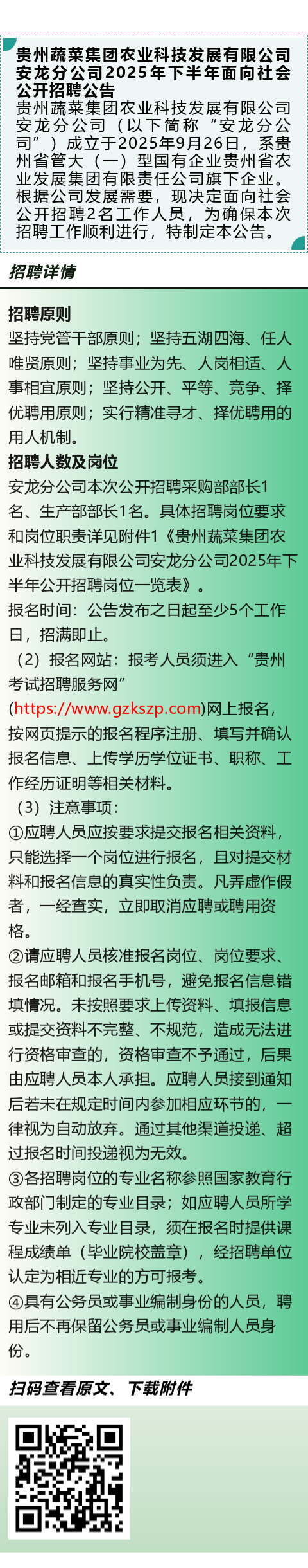 【国企】贵州蔬菜集团农业科技发展有限公司安龙分公司招聘!正在报名!