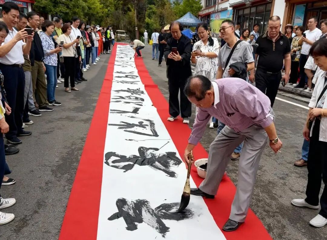 在书画创作达到高潮阶段,书画家们纷纷提起大斗笔在百米长卷上挥洒豪情:书写“祖国万岁”“国泰民安”等磅礴词句,以遒劲笔力展现对祖国的赤诚;“乡愁故里”“花好月圆”等诗意表达,则将家国情怀与文化根脉融为一体。艺术家们以楷、行、草、篆、隶诸体挥毫,既有传统笔墨的筋骨,又见现代艺术的张力。