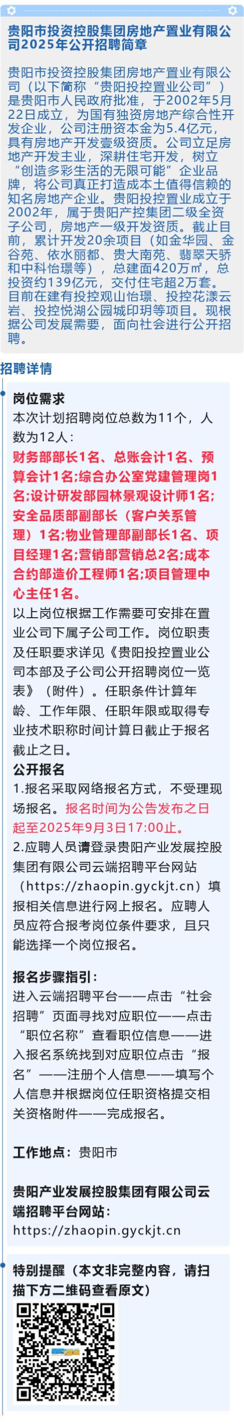 【国企】贵阳市投资控股集团房地产置业有限公司招聘!报名截止时间:9月3日!
