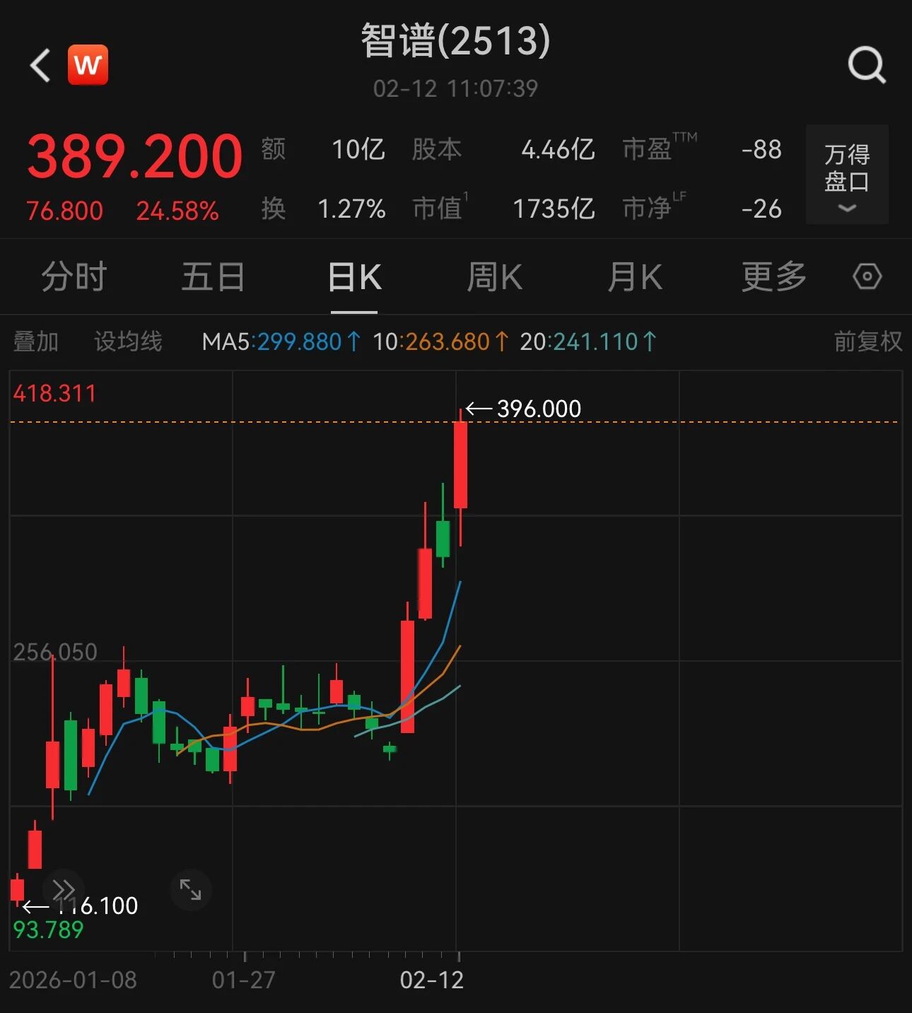 12日,智谱早盘股价急升,盘中高见396港元,创上市新高,截至11:07,日内涨超24%,报389.200港元/股,市值突破1700亿港元。