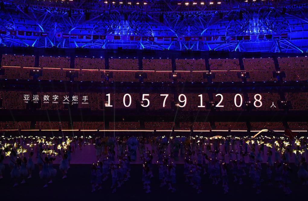 这是9月23日拍摄的开幕式现场显示的亚运数字火炬手人数。新华社记者 黄宗治 摄