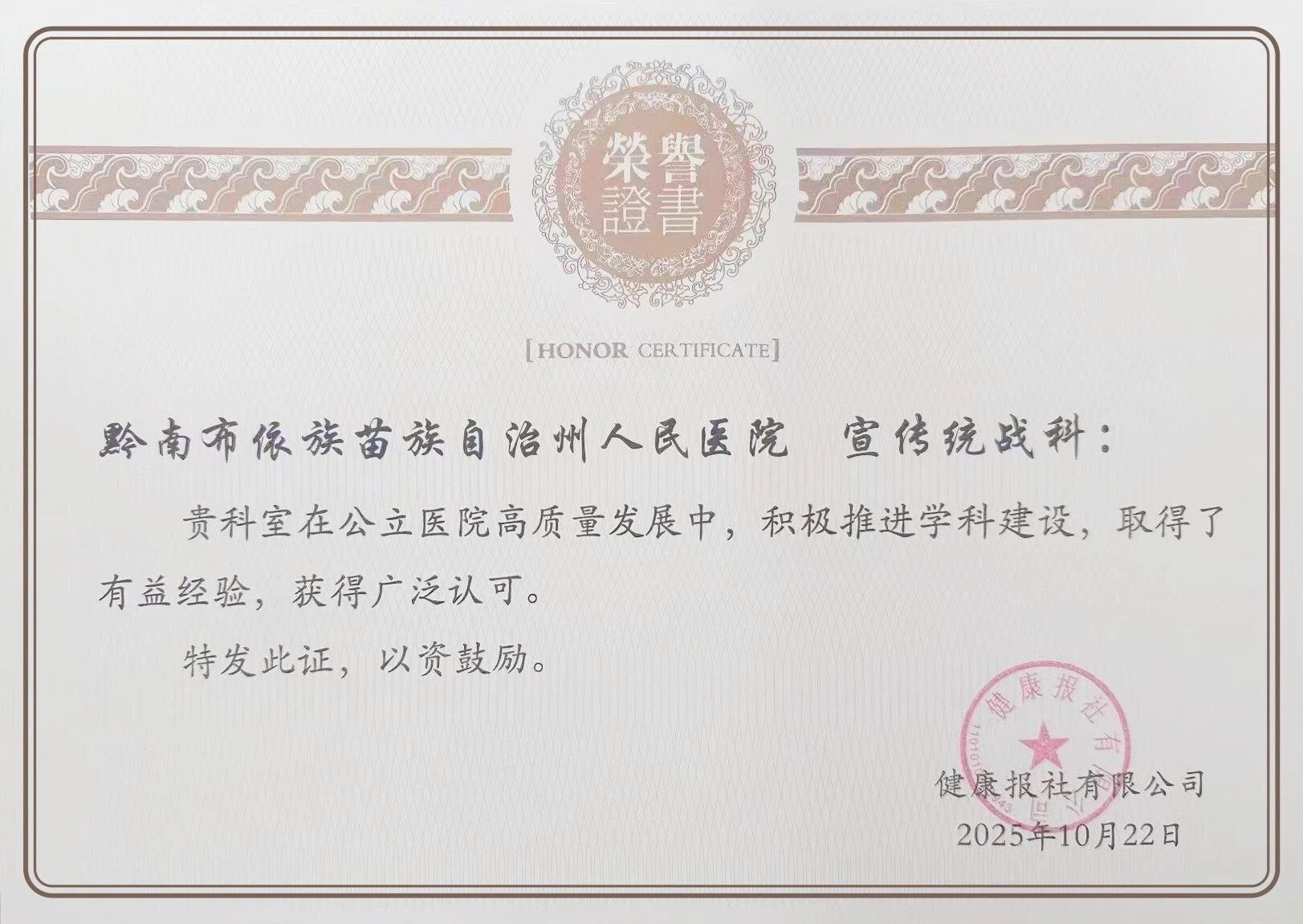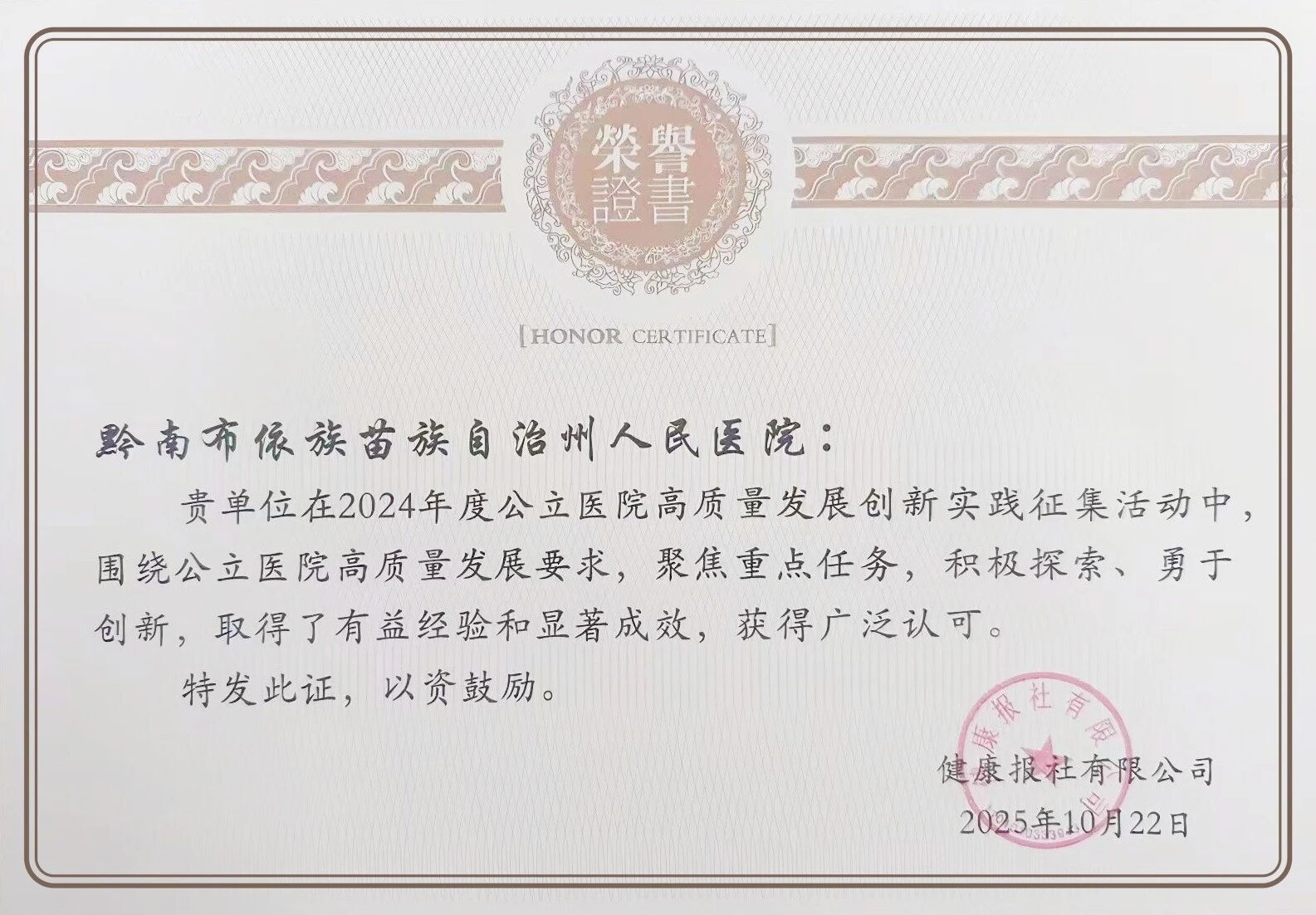 此次从全国公立医院中脱颖而出,斩获这份荣誉,既是对黔南州人民医院宣传工作的高度肯定,更是对医院在提升公众健康意识、传播医疗知识、推动高质量发展等方面作出突出贡献的权威认可!