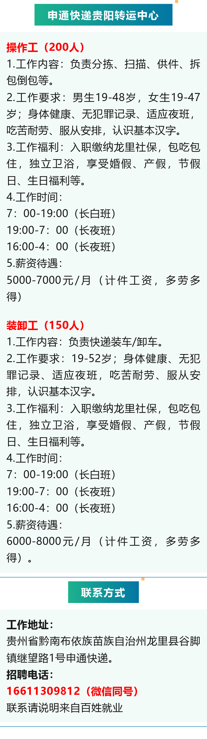 申通快递贵阳转运中心招聘350人!月薪5000~8000元!包吃包住!