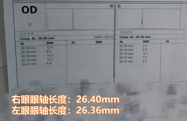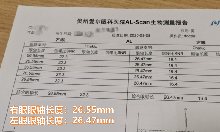 2015年8月,15岁的小宇(化名)因视力持续下降前往贵州爱尔眼科就诊,初次检查显示其右眼眼轴长度为26.40mm、左眼眼轴长度为26.36mm,这一数据已超出15岁青少年的正常眼轴范围(通常为23-24mm),提示近视进展风险较高。
