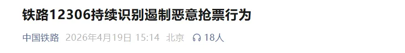 19日,据微信公众号“中国铁路”消息,铁路12306持续识别遏制恶意抢票行为,努力营造公平公正的购票环境。