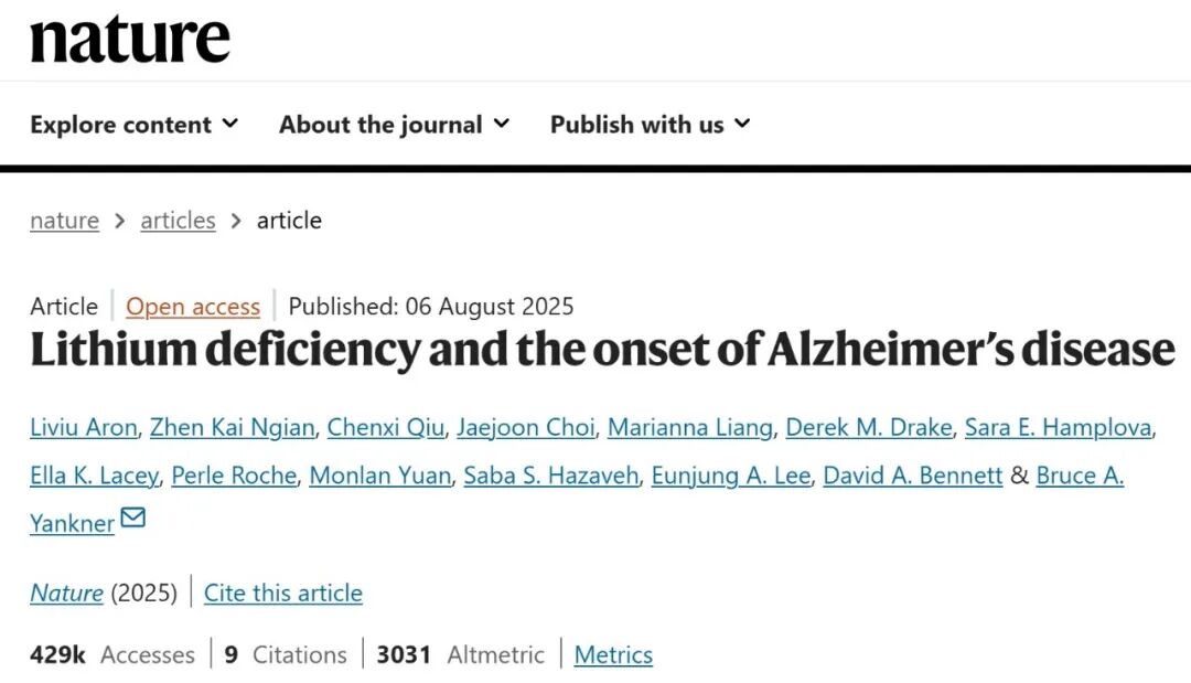 2025年8月,哈佛大学医学院的研究人员在《Nature》期刊发表了题为“锂缺乏与阿尔茨海默病的发生”的重大研究。这项研究首次证实,大脑中金属元素锂的缺乏会导致认知能力下降,与AD的发病直接相关。该研究发现,锂可以被AD的经典病理标志Aβ斑块捕获结合,降低了其生物可用性,并形成锂缺乏-Aβ斑块沉积-锂进一步降低的恶性循环。研究进一步发现,一种特殊类型的锂补充剂——乳清酸锂(lithium orotate),由于其较低的电导率,能够绕过淀粉样斑块的截留,恢复大脑锂稳态。