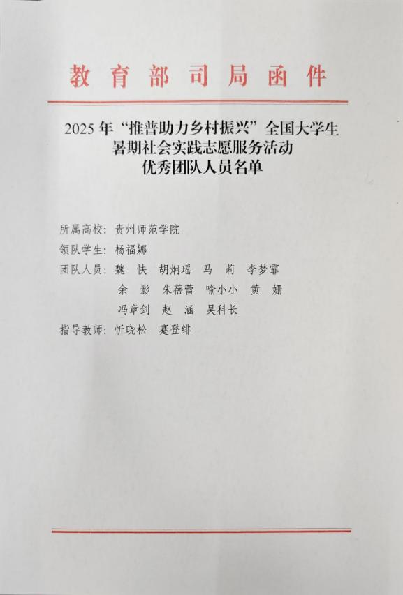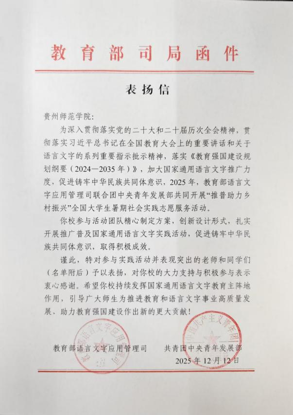 近日,教育部语言文字应用管理司、共青团中央青年发展部联合向贵州师范学院发来书面表扬信,对贵州师范学院文学与传媒学院“知音黔行”志愿服务队作为2025年“推普助力乡村振兴”全国大学生暑期社会实践志愿服务活动重点团队的突出表现予以通报表扬。该实践团队在2024年和2025年连续两年入选“推普助力乡村振兴”全国大学生暑期社会实践志愿服务活动,并连续两年荣获“优秀团队”称号。