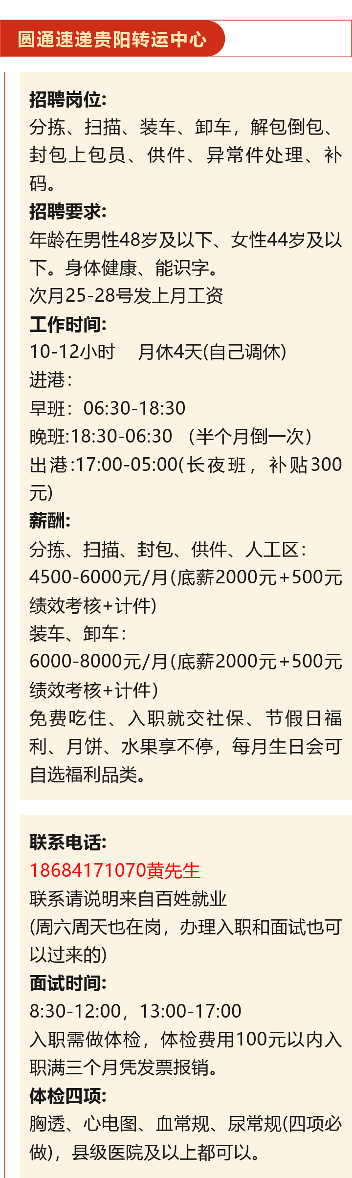 【知名企业】圆通速递贵阳转运中心招聘!月薪4500~8000元!免费吃住!