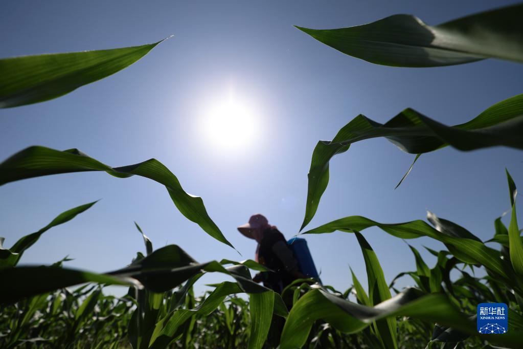 7月5日,山东省临沂市郯城县郯城街道农民在玉米田间劳作。新华社发(张春雷摄)