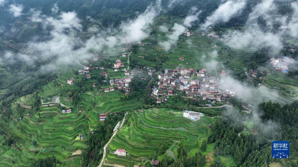 7月5日在贵州省锦屏县固本乡东庄村拍摄的雨后景色(无人机照片)。新华社发(杨晓海摄)