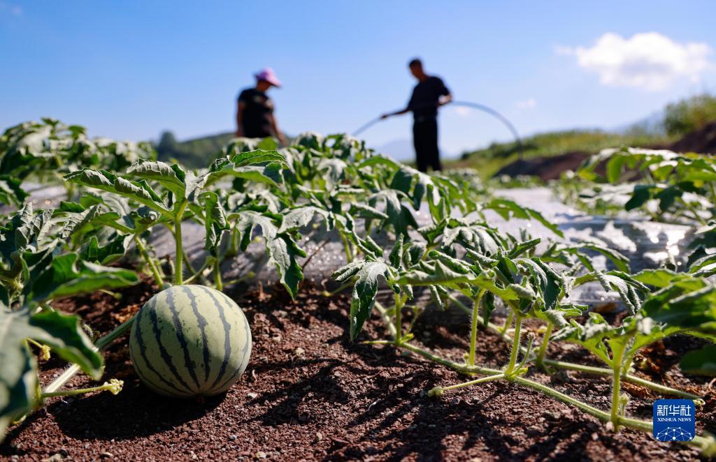 7月5日,农民在贵州省遵义市正安县安场镇给西瓜浇水。新华社发(赵永章摄)